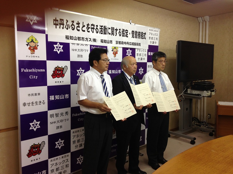 弊社は民間事業者が地域の見守り活動を行う「中丹ふるさとを守る絆ネット推進事業」に参画することとし、8月1日、福知山市役所で弊社と京都府、福知山市間で協定書締結しました。 |